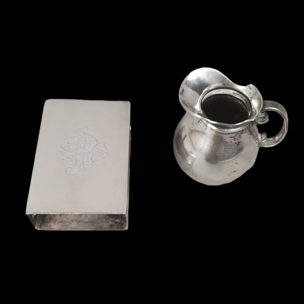 Jarro miniatura em prata Portuguesa de 833/1000. Marca de contraste do Porto, Javali. Fosforeira em prata estrangeira decorada com monograma. Peso total: 59,4 grs. Dim (maior): 5,5 cm.