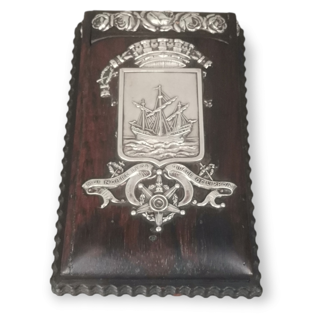 Madeira de pau santo com aplicações em prata com os símbolos de Lisboa. Sem marcas, ao abrigo do Decreto-Lei 120/2017, de 15 de Setembro - art. 2º, n.º 2, alínea c). Faltas e defeitos. Peso (bruto): 312 grs. Dim: 18 X 12 cm.