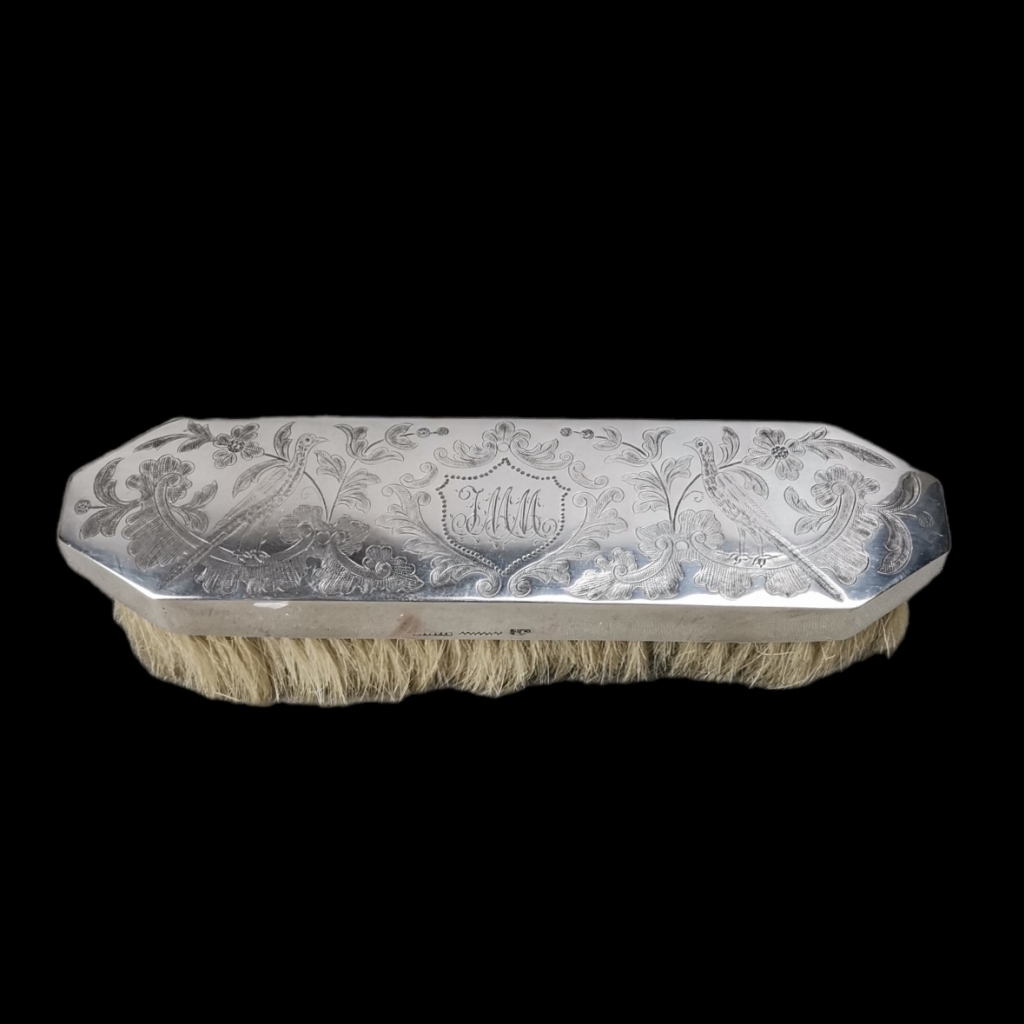 Prata Portuguesa. Marca de contras do Porto do ensaiador Guilherme Guedes Padilha. Decoração floral cinzelada. Iniciais ao centro. Peso (bruto): 116 grs.