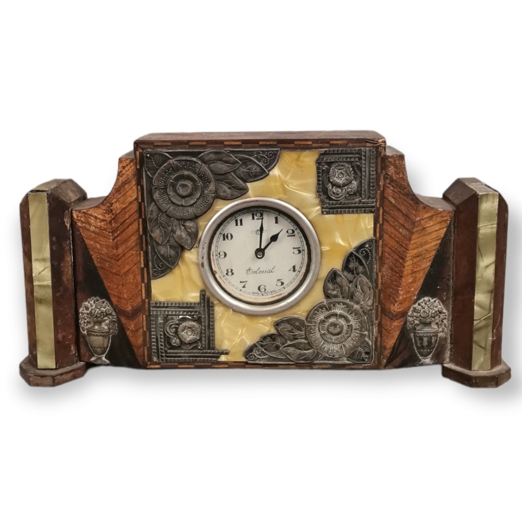 Madeira folheada, com aplicações em baquelite e prata, contrastes Javali (1887-1937), de 833 milésimos. Faltas e defeitos e mecanismo a necessitar de revisão. Dim. 13 x 25,5 x 5 cm.