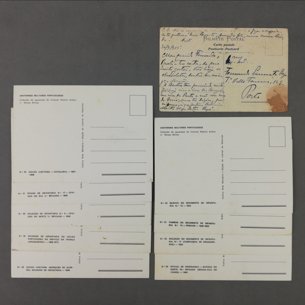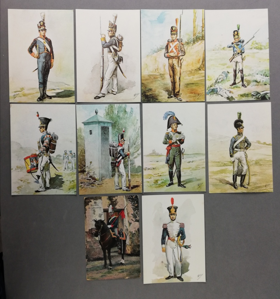Lote de 9 postais segundo aguarelas do Coronel Ribeiro Artur e um postal fotográfico mais antigo com soldado de lanceiros. Dim: (maiores) 10,5 X 15 cm.