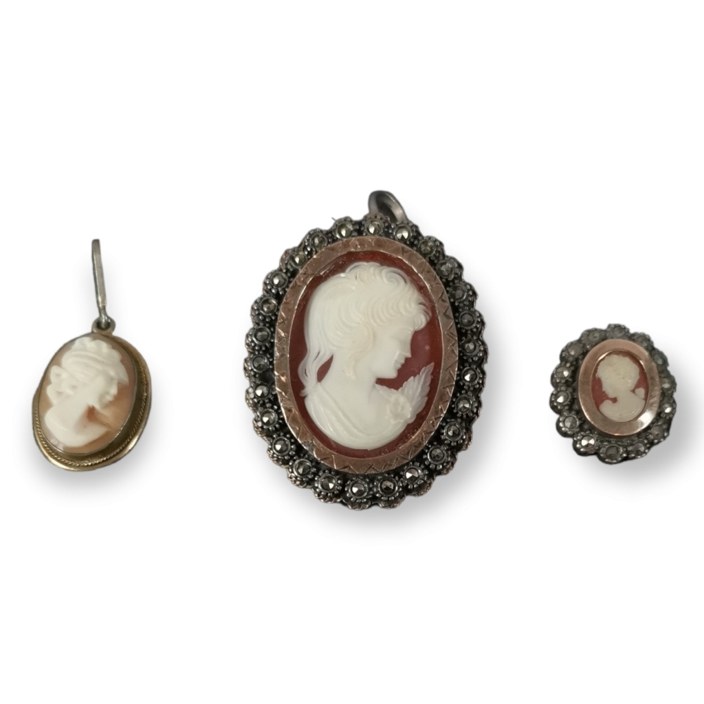 Três camafeus esculpidos com bustos de senhora. Aros em prata. Sem marcas, ao abrigo do Decreto-Lei 120/2017, de 15 de Setembro - art. 2º, n.º 2, alínea c). Peso: 14 grs. Dim (maior): 3 X 2,5 cm.