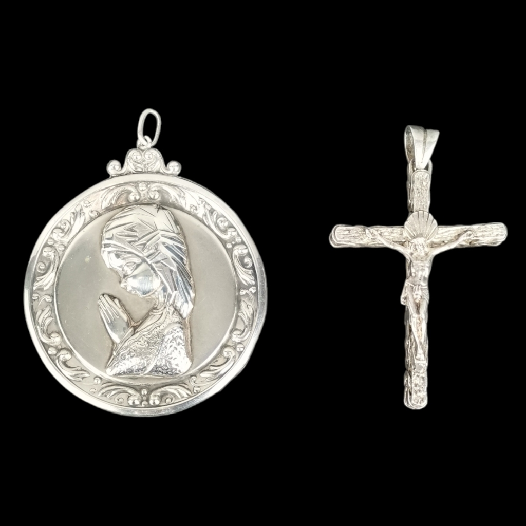 Decoração relevada. Sinais de uso. Sem marcas, ao abrigo do Decreto-Lei 120/2017, de 15 de Setembro - art. 2º, n.º 2, alínea c). Cristo com marca 925. Peso: 60,28