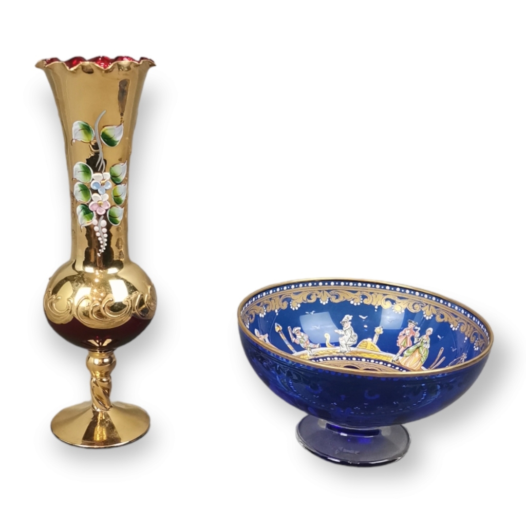 Email € 26 Taça em vidro azul decorada com figuras e jarra em vidro rubi parcialmente dourada e pintada.Dim (taça): 13 cm. Alt (jarra): 19 cm. € 15 € 26 Solicitar informação adicional Voltar a: Leilão 363 - Coleccionismo Taça em vidro azul decorada com figuras e jarra em vidro rubi parcialmente dourada e pintada.Dim (taça): 13 cm. Alt (jarra): 19 cm. € 15 € 26