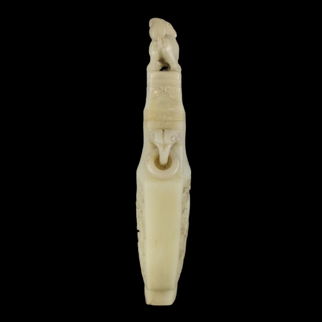 Vaso com tampa em jade esculpido em alto relevo. Pegas laterais esculpidas da mesma peça. Tampa encimada por cão de fô. Cauda colada. Dim: 49 X 21 X 5,5 cm.