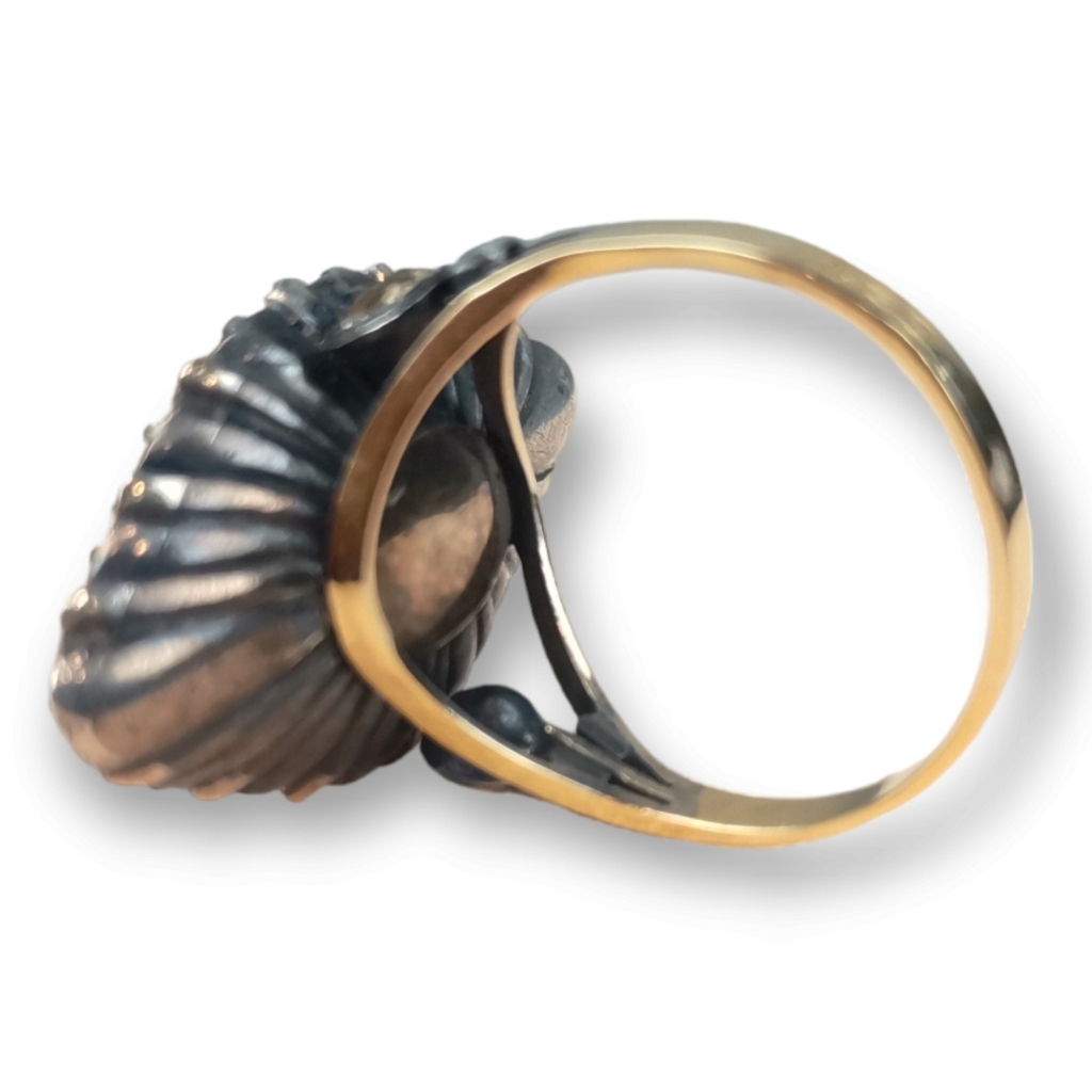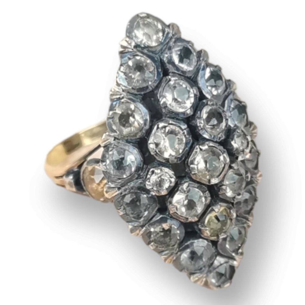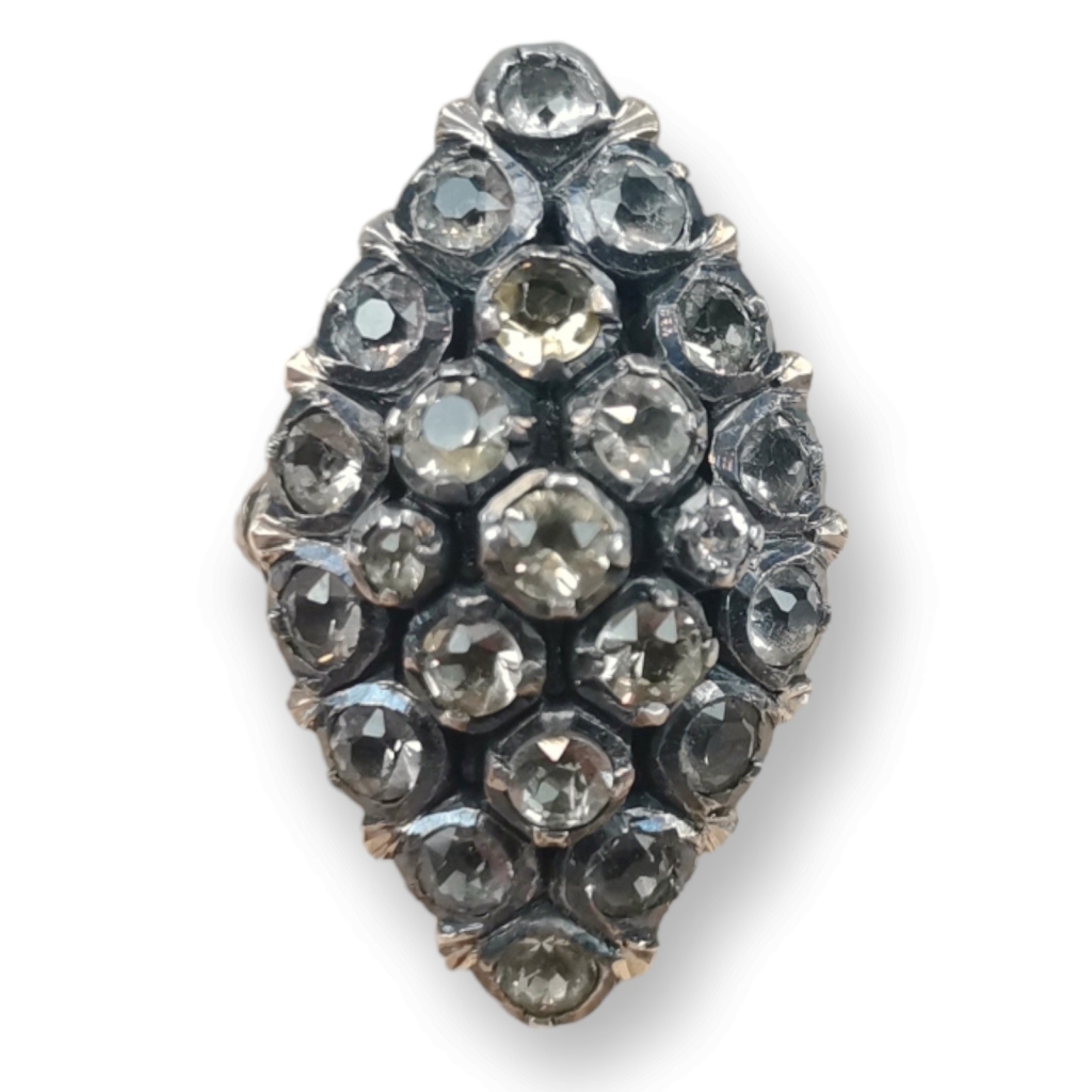 Formato de losango cravejado de pedras de fantasia. Marcas de contraste do Porto. Ouro de 800/1000 e pratade de 835/1000. Peso: 8,82 grs. Dim: 2,8 X 1,8 cm.