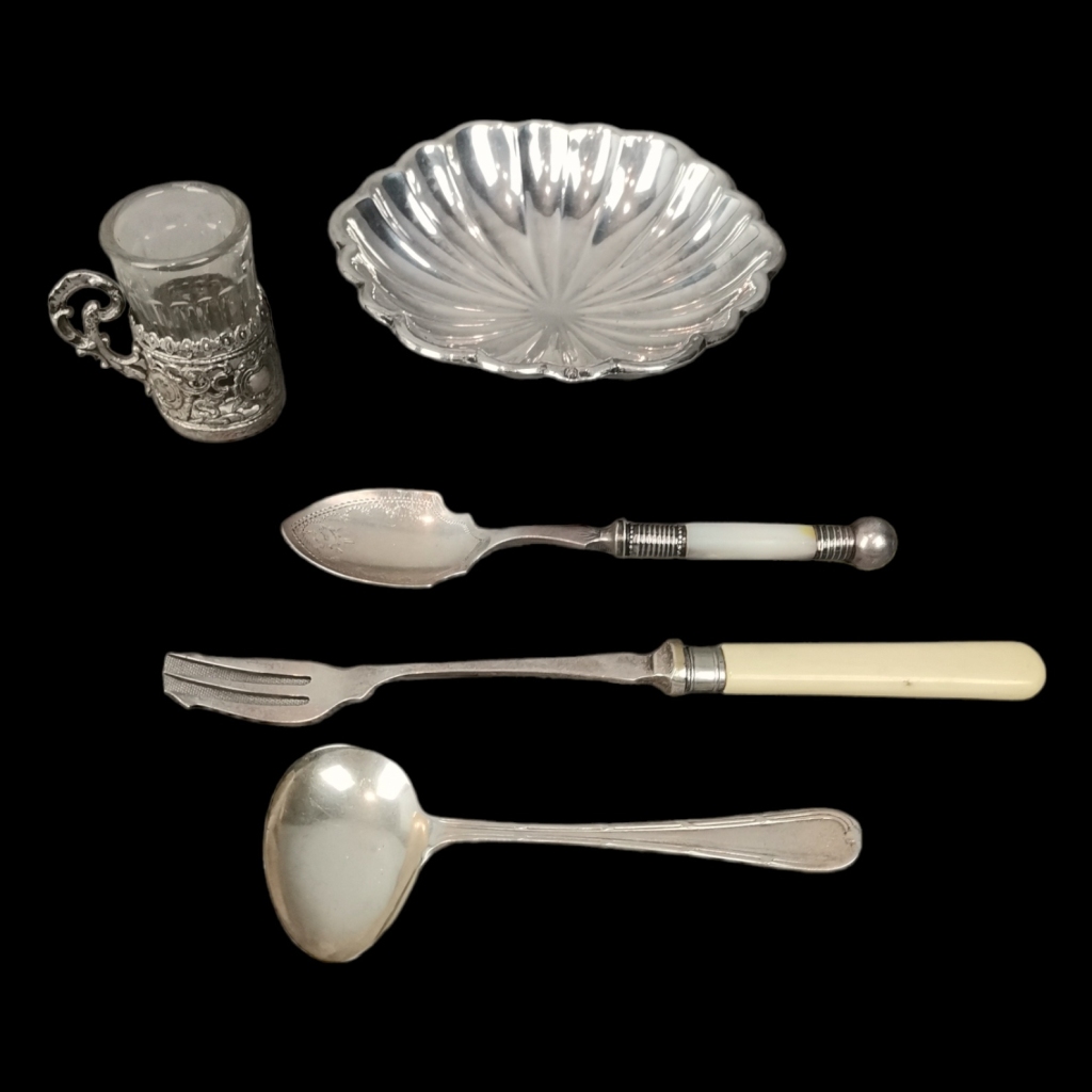 Email € 12 Duas colheres, um garfo de pickles, uma tacinha em metal prateado e pequeno copo com base WMF. Sinais de uso.Dim (maior): 18,5 cm. € 10 € 12 Solicitar informação adicional Voltar a: Leilão 377 - Coleccionismo Duas colheres, um garfo de pickles, uma tacinha em metal prateado e pequeno copo com base WMF. Sinais de uso.Dim (maior): 18,5 cm. € 10 € 12