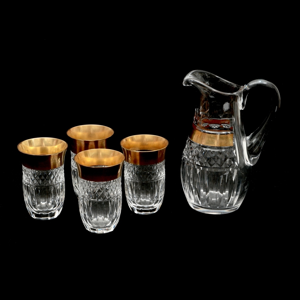 Cristal moldado e lapidado com decoração de faixa a ouro. Europa, 1.ª metade do séc. XX. Um dos copos com duas ínfimas falhas no bordo. Dim. (jarro) 23,5 cm; (copos) 12,5 cm