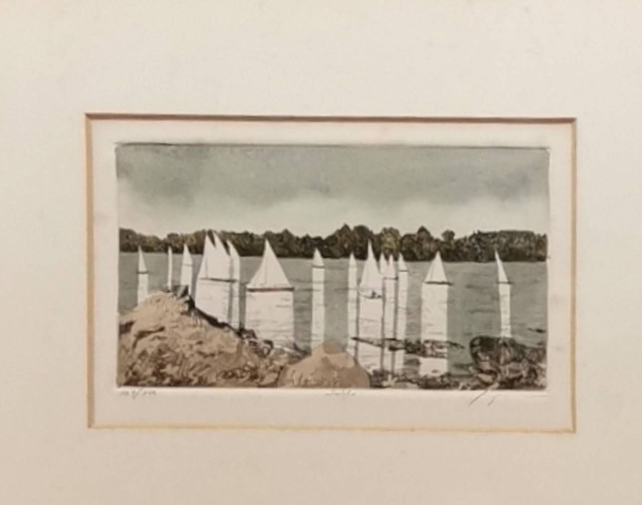 Gravuras coloridas com vista de costa e veleiros. Tiragem 134/200 e 109/200. Molduras douradas e passpartout. Dim (maior): 12 X 20 cm Total com moldura: 30 X 36 cm. Dim (menor): 10 X 17 cm. Total com moldura: 27,5 X 34 cm.