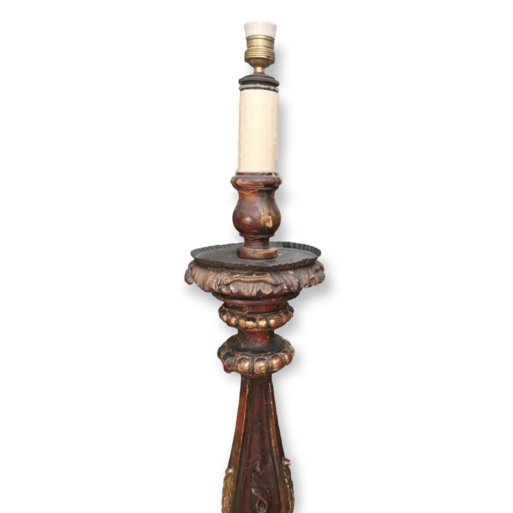 D. João V (1689-1750). Madeira entalhada, pintada e dourada. Restauros e defeitos na policromia. Electrificado. Quebra luz em tecido creme. Alt: 150 cm Total com quebra luz: 190 cm.