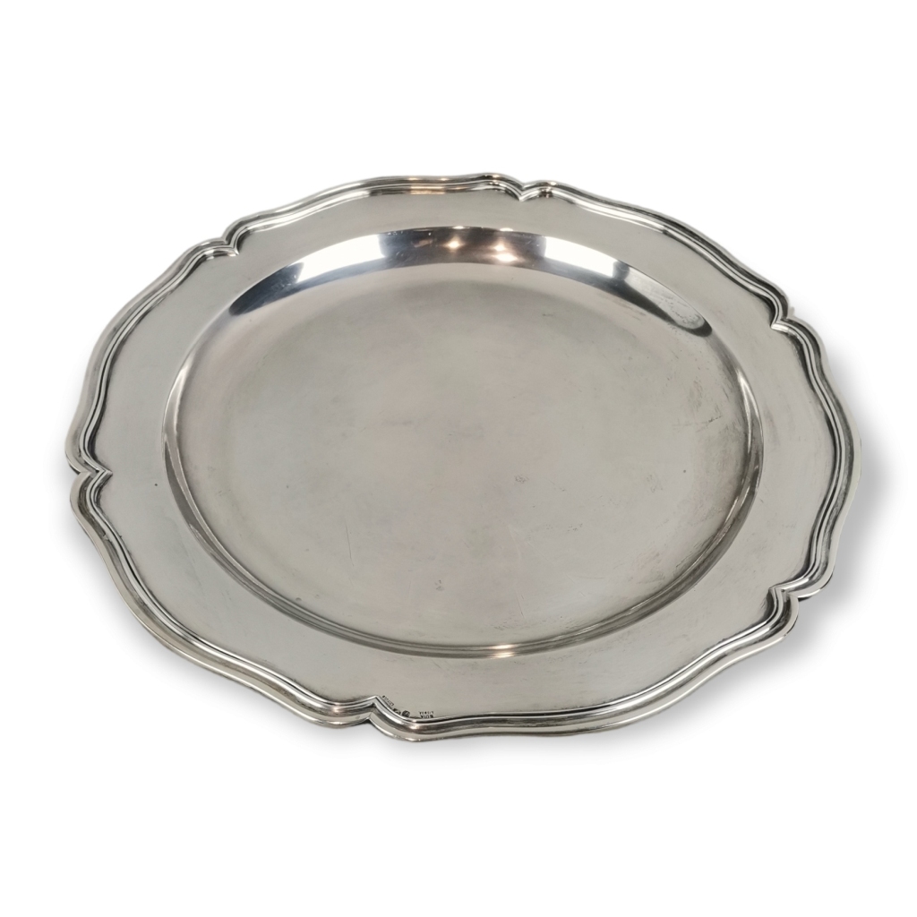 Prata Portuguesa de 916/1000. Marca de contraste do Porto, Águia (1887-1937). Ourivesaria da Guia Fundo liso com bordo recortado decorado com nervuras. Peso 1605 grs. Dim: 40 cm.