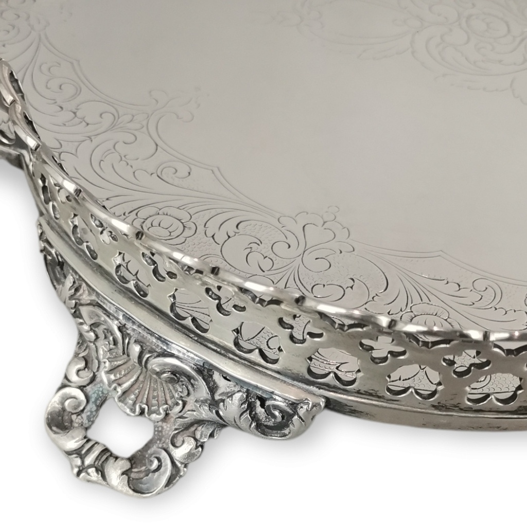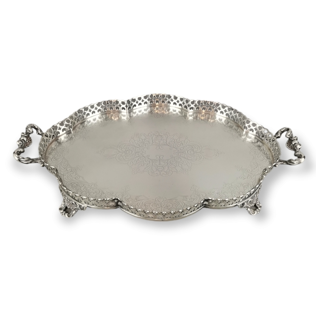 Prata Portuguesa de 833/1000. Marca de contraste do Porto, Águia. Fabricante Topázio.Fundo ricamente cinzelado com motivos vegetalistas. Bordo lobolado com gradinha transfurada. Pegas e pés decorados com concheados e folhagem. Peso: 1925 grs.Dim: 53,5 X 34 cm.