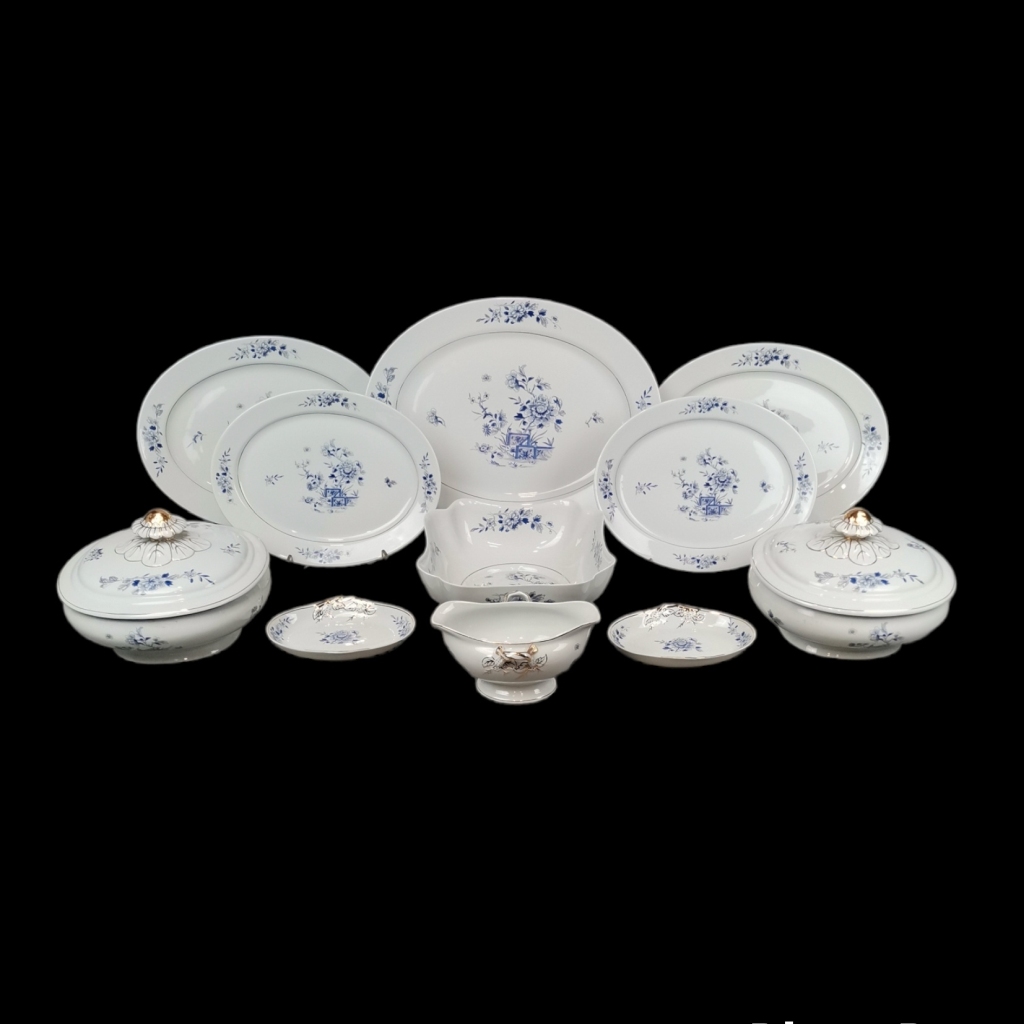Com 24 pratos rasos, 12 de sopa, 12 de sobremesa, 2 pratos cobertos, cinco travessas, uma molheira e 2 covilhetes e uma saladeira. Total de 71 peças. Decoração floral a azul e fio de ouro. Marca nº 34 (1971-1980)Atenção: Este serviço será entregue nas nossas instalações não embalado.