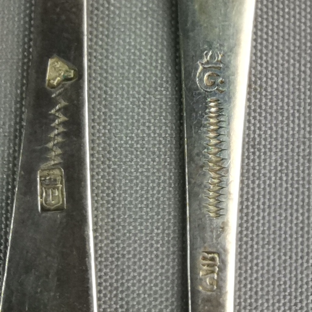 Três colheres com marcas de contraste de Guimarães e marca de ourives AIB não identificado datável do fim do séc XVIII. Uma colher com a mesma decoração mas maior com marca de contraste do Porto do ensaiador Guilherme Mancilha Peso total: 59 grs