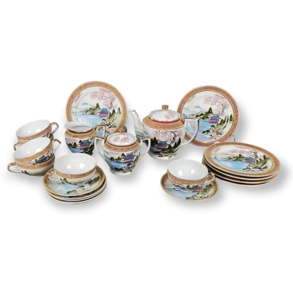 Porcelana do Japão. Decorada com paisagens e dourado. Bule, açucareiro, leiteira, 6 chávenas e cinco pires e seis pratos de bolo. Falhas no bule e dois pratos de bolo. Alt bule: 16 cm.